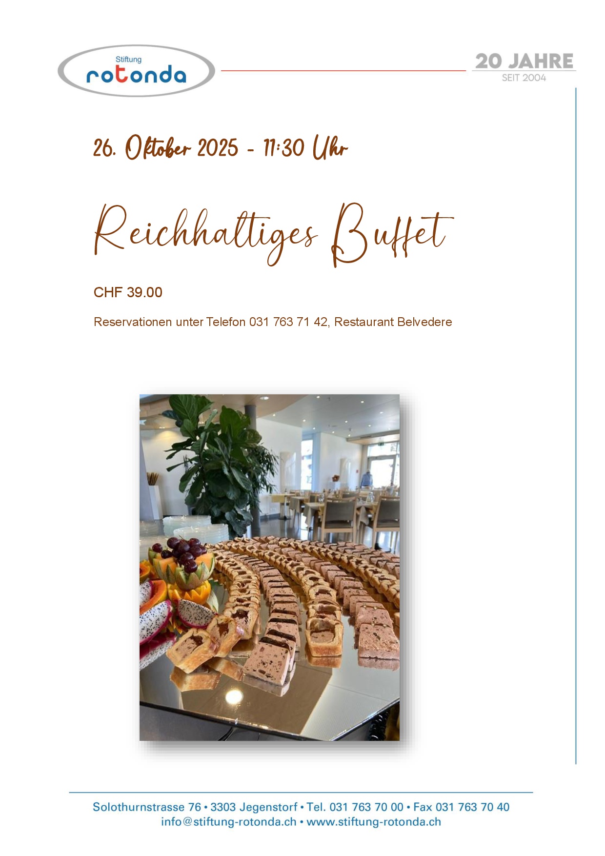 - vormittags: Kaffeepause mit Kaffee, Tee, Orangensaft, Gipfeli und Fruchtkorb