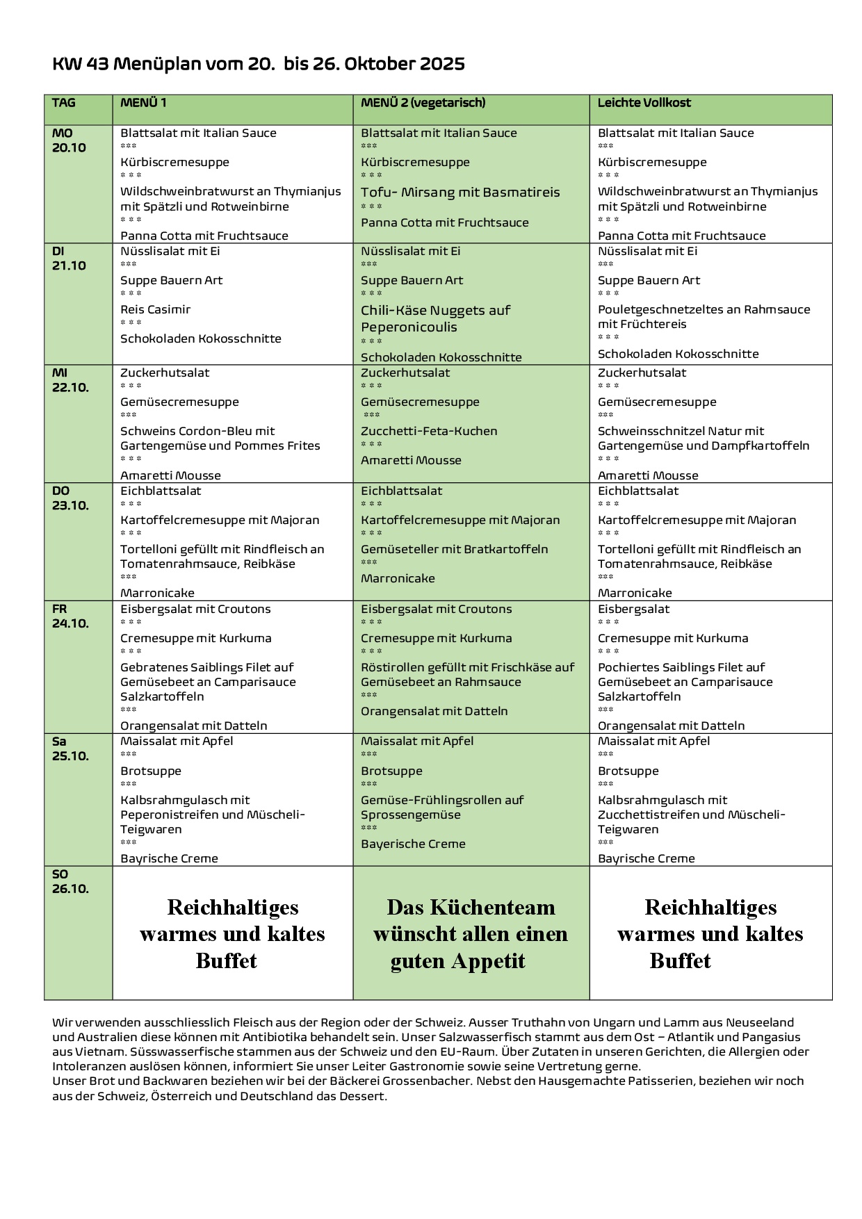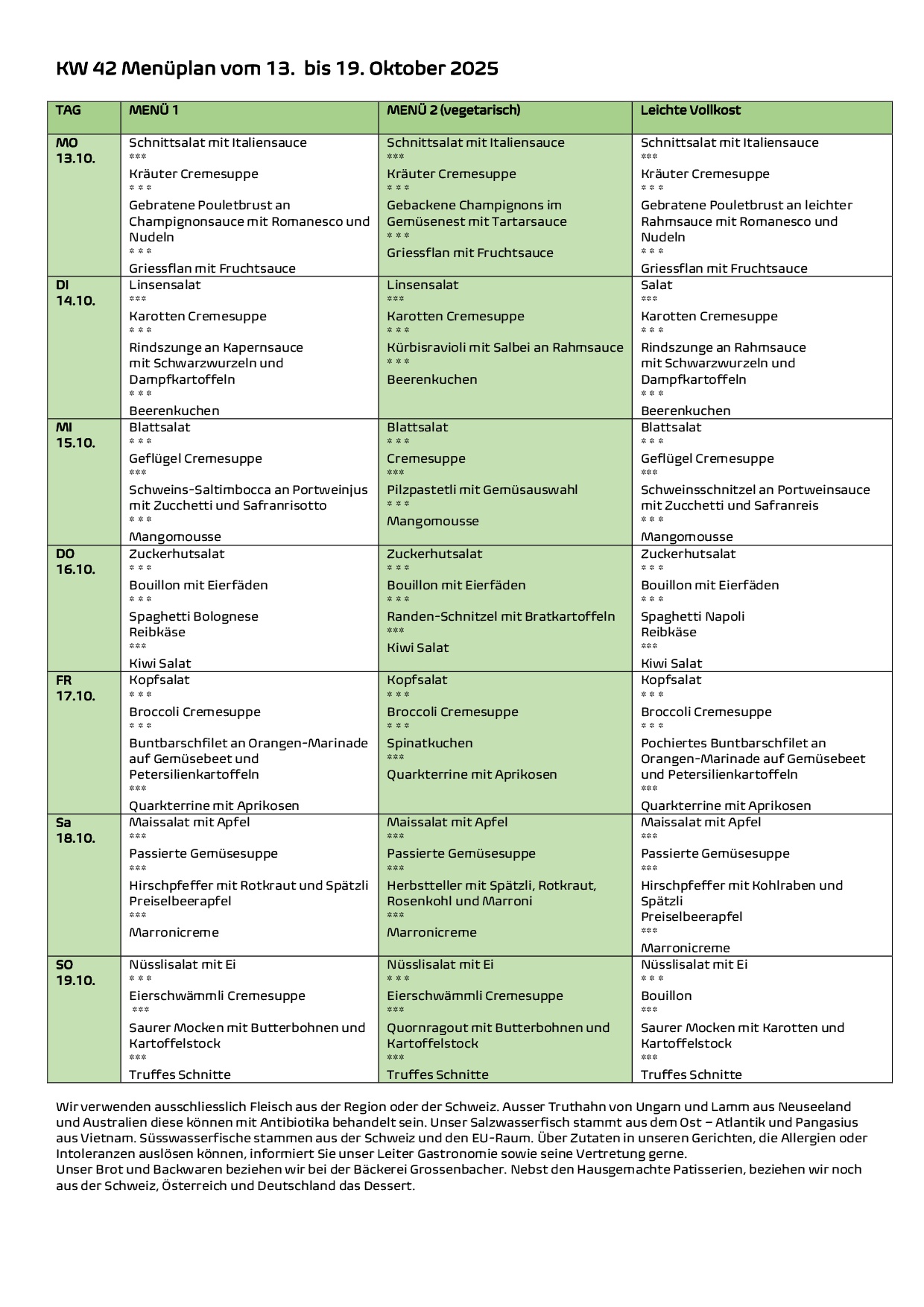 - mittags: 4-Gang-Mittagessen gemäss Menuplan mit Mineralwasser und Kaffee